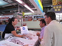 El alcalde de Benicarló, Marcelino Domingo, y el concejal de Agricultura, Eduardo Arín, han repartido esta mañana 10.000 bolsas de plástico entre las 9 pescaderías del Mercado para promocionar la marca "Pescado de Benicarló. Fresco de Costa".