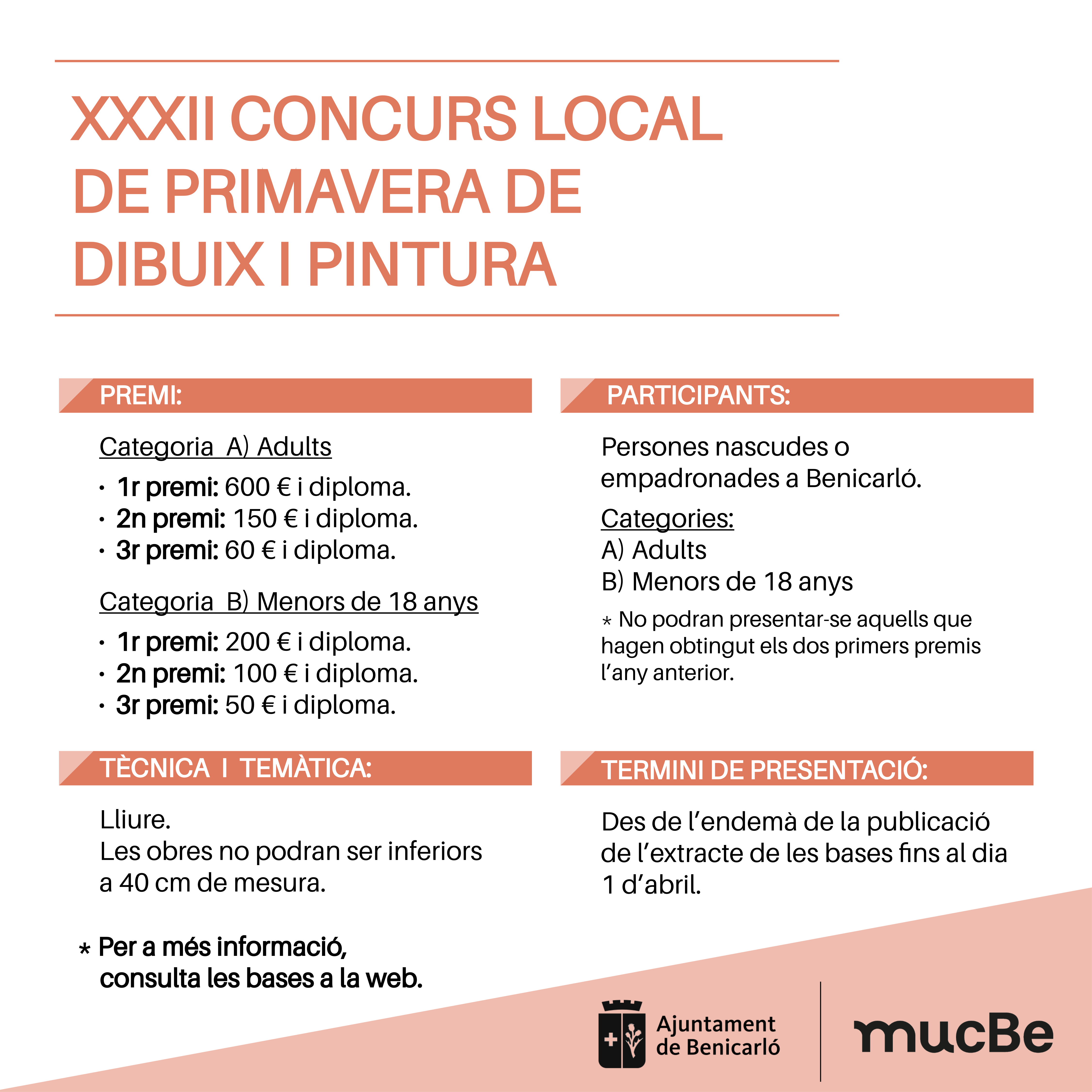 S'estableix una categoria per a adults i una altra per a menors de 18 anys. El termini de presentació de les obres finalitza l'1 d'abril.