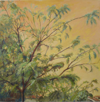 su atención en el tema arbóreo, ramas, tronco, follaje y flores que