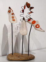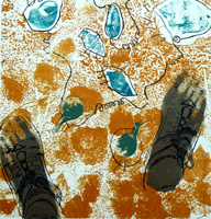 En front tenim tres sèries lligades entre elles: MAR, MAR, MAR ... És una offsetgrafia que utilitza 4 i 5 tintes i pintura acrílica sobre paper; amb una tirada de 15 exemplars. En ella es poden veure dos peus que, travessant una zona de fulles seques, tenen intenció d’arribar a la mar. Cadascun d’aquests gravats està relacionat mitjançant uns encerclats de colors vius, amb una altra peça que li modifica lleugerament el seu significat i que pertany a alguna de les següents sèries, que modesta i humilment, entren una mica dintre del terreny de la poesia visual: FINESTRES. Cada caixa té unes mides diferents. Estan realitzades amb tècnica mixta: Resina de polièster, collage i materials diversos, damunt fusta. En uns casos, mitjançant la transparència del material, descobrim les capes d’un petit mon de subtileses empresonades. Fòssils i eriçons donen pas al vent que juga amb la remor dels caragols, s’envolta amb la cançó de les fulles dels arbres, fent caure els seus fruits en la terra o enduent-se’ls a través de la mar i el cel encara molt més lluny. A la fi els records travessen l’espai, s’endinsen en lo més profund i amb una enyorança melangiosa, envoltats en silenci, acaben caient en l’oblit. Per últim el conjunt de peces Petjades en el camí. Cada escultura té unes mides diferents i estan realitzades per acoblament de pedra, ferro, fusta i materials diversos. Els peus que veiem en els quadres de dalt han sortit del espai pictòric i pretenen passejar pel mar. En el seu camí troben petites meravelles: palets erosionats, pedres i vidres, molls, restes dels focs d’artifici d’alguna festa major, una corbella, fustes i troncs amb formes de caprici, ulleres, obrellaunes, els jugadors d’un antic futbolí, ressonàncies d’una infantesa perduda o d’un temps parat i extasiat amb les petites coses... qui ho sap... I sense parar, aquest fil que no descansa. Què és? El fum, el camí, el vol de les orenetes que ens deia Fernando, el pensament, alguna mena de recorregut visual, el fil conductor o el cosidor,...Vosaltres mateixos. Escolliu l’opció que més us agrade, o millor, aporteu les vostres pròpies lectures. Al cap i a la fi és la gràcia que té el llenguatge visual, al enfrontar-nos en l’obra no hi ha res escrit, res no val sobre les sensacions i vibracions personals. Així a cadascú li esdevé un espill divers on l’obra es reflexa de manera diferent. Espere que gaudiu d’una bona estona i estada en aquest magnífic museu, podent estar ben orgullosos de tenir-lo tant a l’abast, i moltes gràcies a tothom per la vostra pacient atenció. Creat per llujan el 19/02/2008