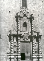 El templo tiene una fachada de piedra labrada que sirve de marco a una monumental portalada barroca de 2 cuerpos flanqueados por columnas salomónicas exentas. El cuerpo superior está formado por una hornacina con la imagen de San Bartolomé, desaparecida en la Guerra Civil y sustituida en 1981. También desaparecieron las imágenes de los santos Abdón y Senén, que se hallaban colocadas sobre los elementos del arquitrabe de las columnas exteriores. El conjunto, salvo por pequeños detalles, se haya en buen estado de conservación.