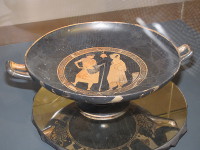 Sin duda, una de las piezas más valiosas de la exposición, la cílica del pintor de Penthesilea, ocupa un lugar destacado en el recorrido. Se trata de una copa griega de magnífica factura, localizada en el Puig de la Nau, que muestra el importante comercio que tenía el poblado con los diferentes mercados de la antigüedad. La pieza, uno de los símbolos de esta exposición, ha sido cedida durante un año por el Museo de Bellas Artes de Castellón, a pesar de que el Mucbe reclamará su cesión permanente cuando tenga la calificación de museo.