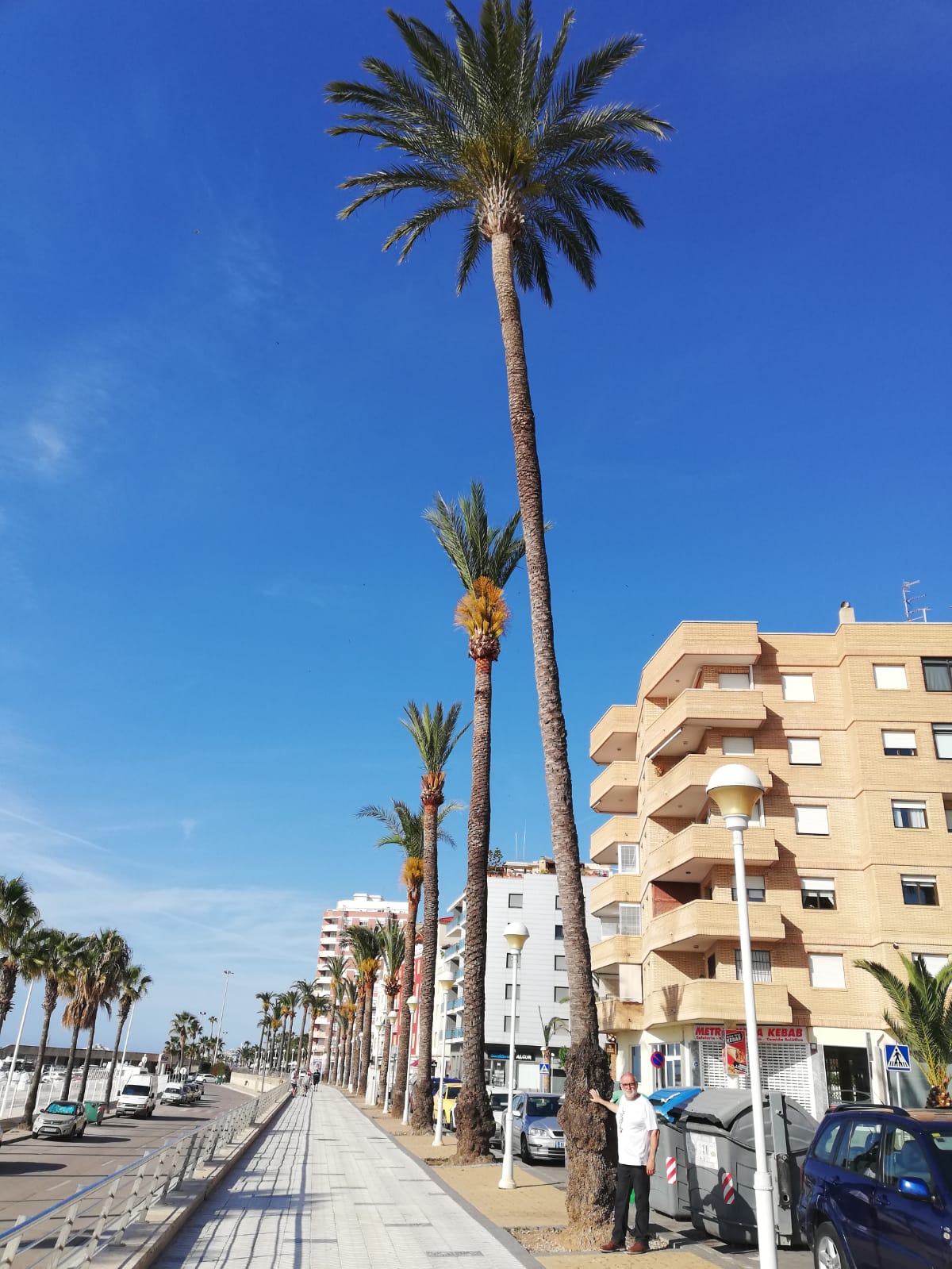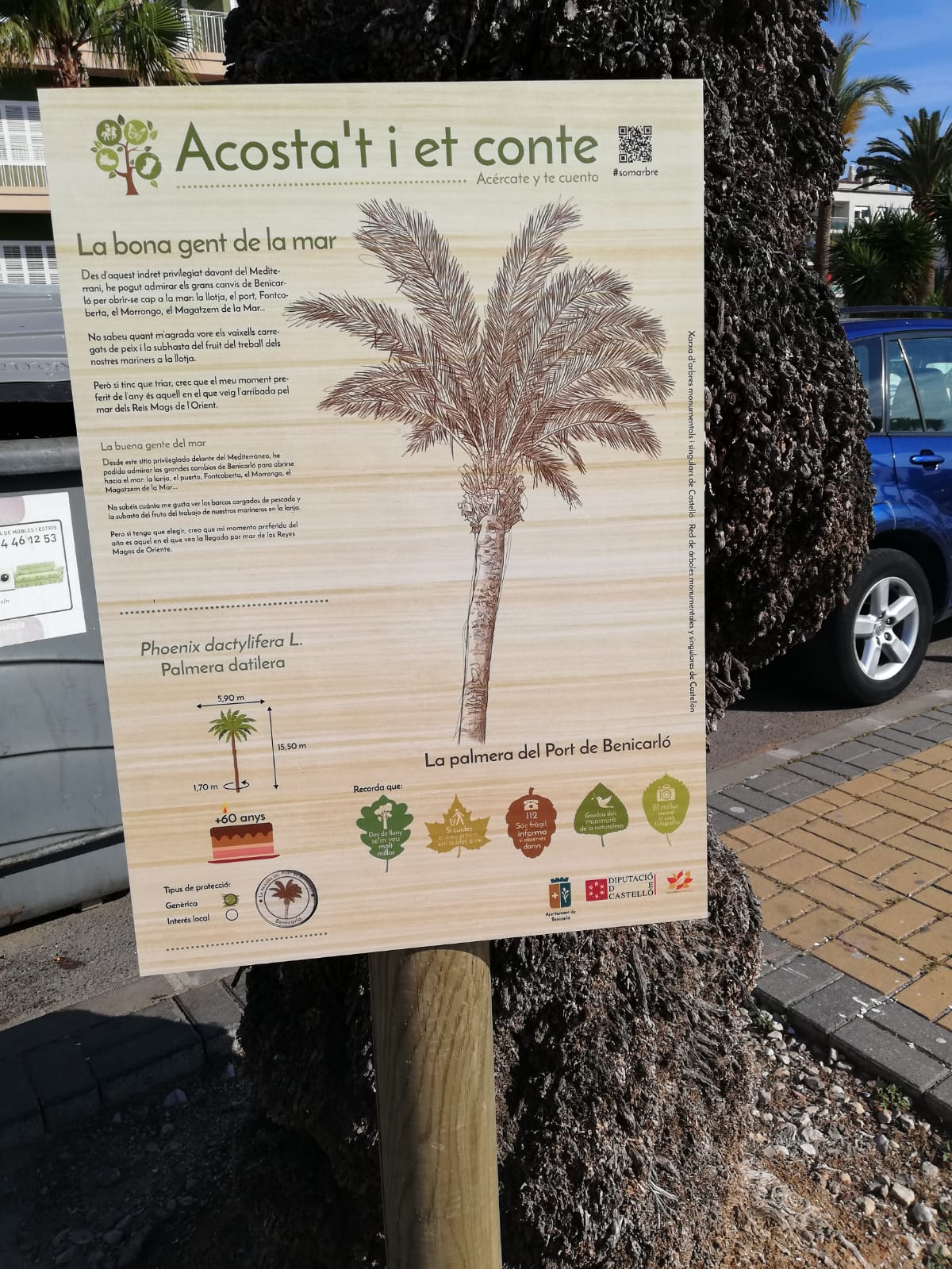 El árbol tiene más de 60 años y hace más de 15 metros de altura. «La buena gente de la mar» es el lema que acompaña el cartel informativo que señaliza esta palmera datilera.