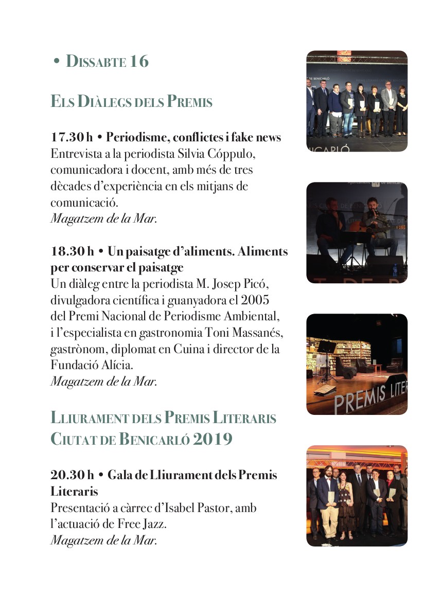 I a partir de les 20.30 hores arrancarà la gala de lliurament dels Premis Literaris, presentada per la periodista d'À Punt Isabel Pastor, que comptarà amb l'actuació musical del grup Free Boleros. L'acte estarà presidit per l'alcaldessa de Benicarló, Xaro Miralles, que estarà acompanyada pel president de la Diputació de Castelló, José Martí.