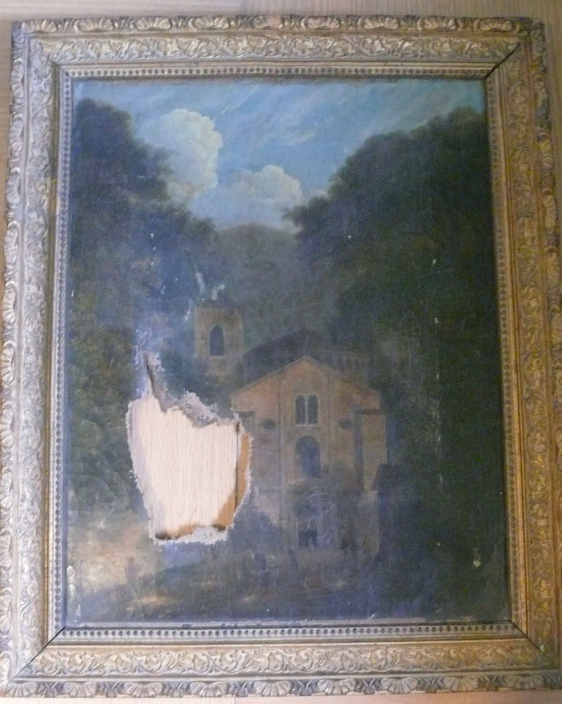 En concret, la primera obra és un oli sobre llenç de 38,4 x 50,3 cm, en la qual es pot observar un paisatge neerlandès amb una església i un campanar, amb una façana d'estil gòtic. Tot i que la data exacta de la peça és desconeguda, podria tractar-se d'una pintura del segle XVIII, coincidint amb l'època de reconstrucció de la Casa del Marqués.