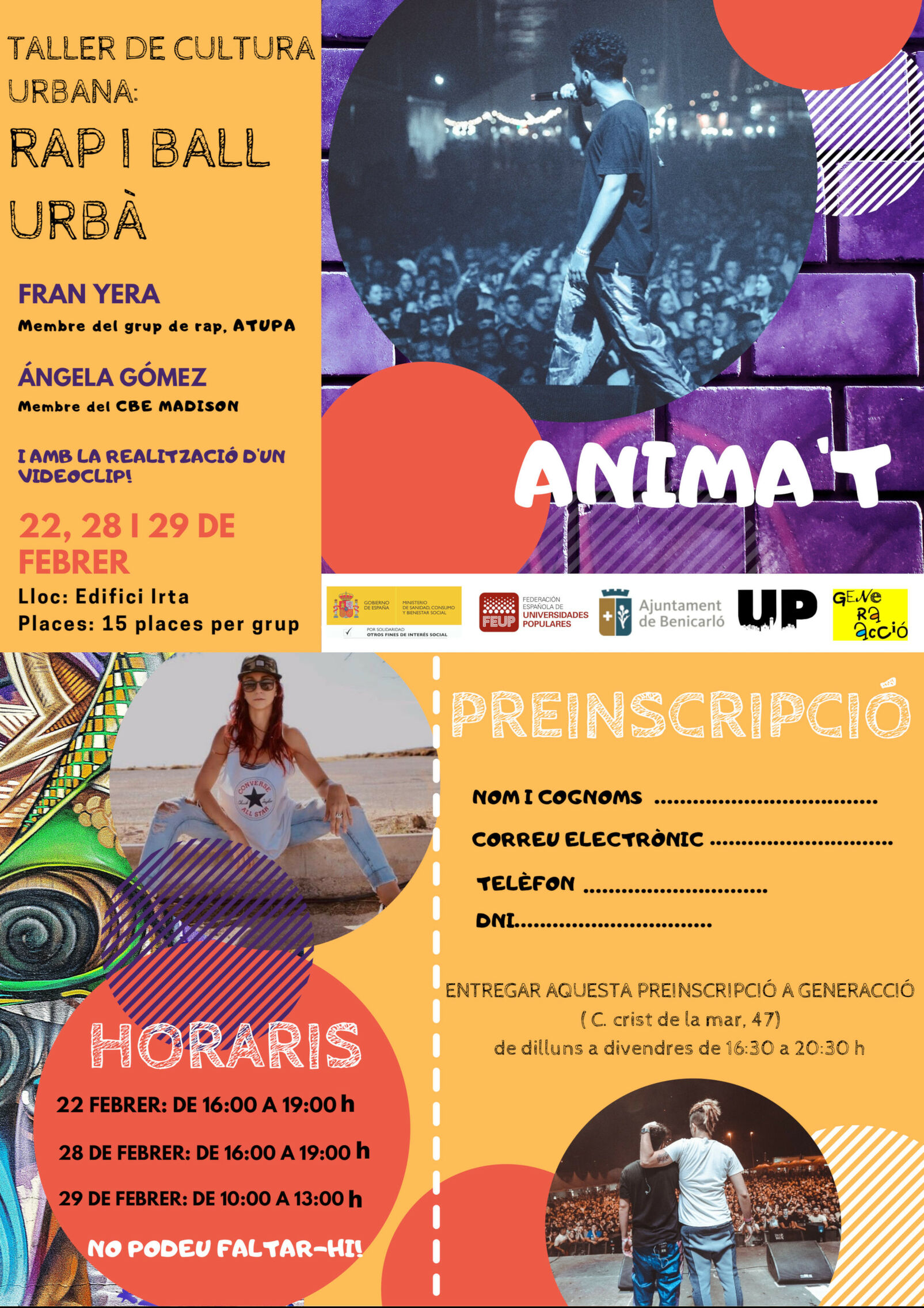 Los talleres se centrarán en enseñar rap y bailes urbanos, y se dividirán en tres jornadas: 22, 28 y 29 de febrero. Las personas interesadas tienen que realizar la preinscripción al local de Generacció.