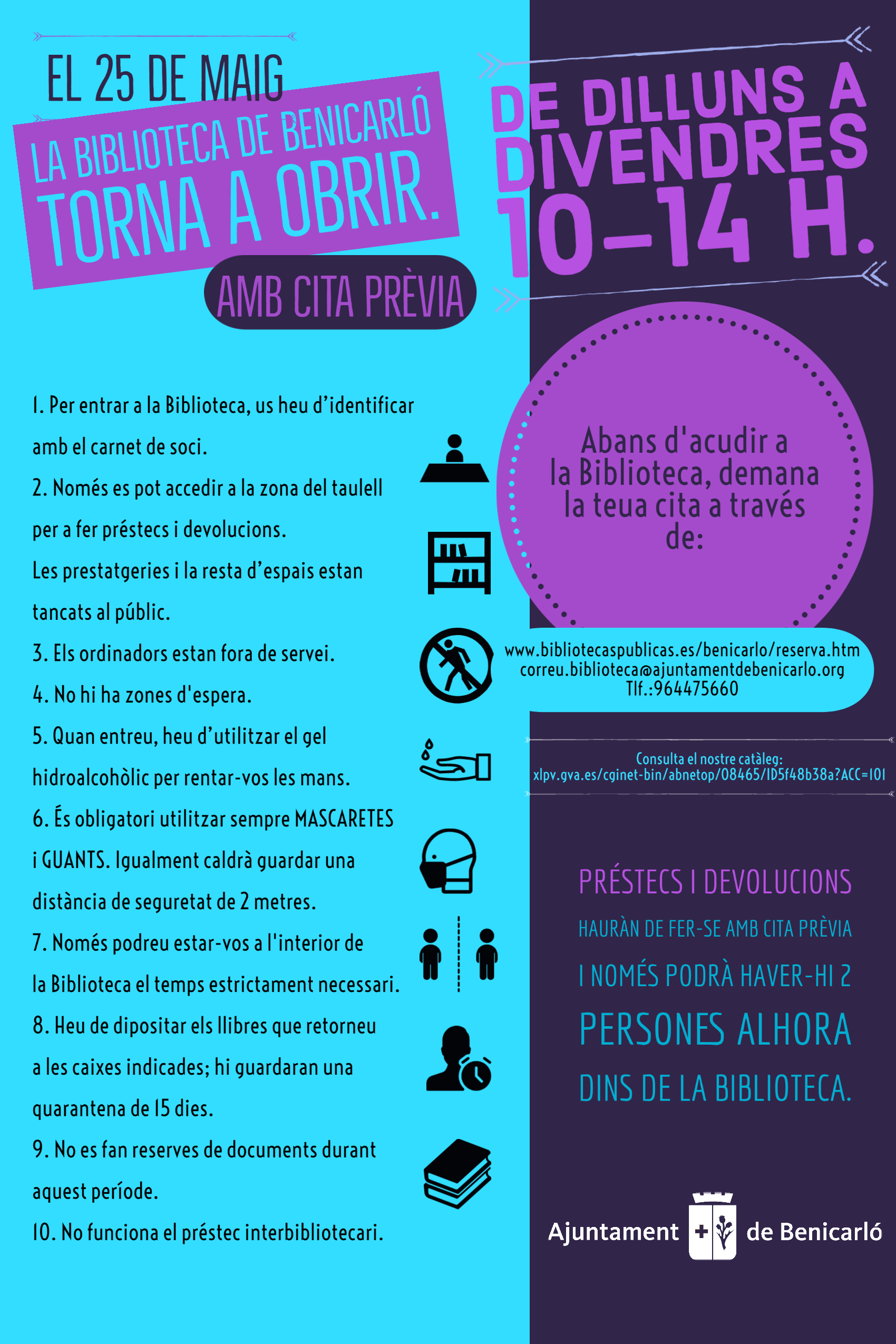 Així per exemple, abans d'acudir caldrà demanar cita prèvia a correu.biblioteca@benicarlo.org o al telèfon 964 47 56 60 i, una vegada a dins, serà necessari identificar-se amb el carnet de soci. Només es podrà accedir a la zona del taulell per a fer préstecs i devolucions i no es podrà accedir a les prestatgeries ni a la zona d'ordinadors que, com la resta d'espais, estaran tancats al públic.