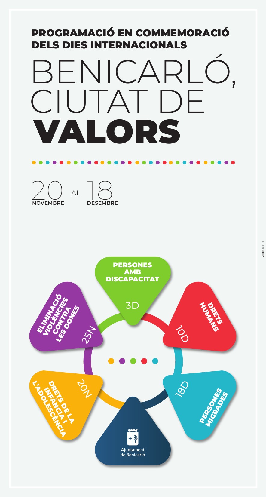 La regidora de Serveis Socials i Polítiques Inclusives, Gemma Cerdá, ha presentat la quarta edició de «Benicarló, Ciutat de Valors», la programació que engloba un conjunt d'actes reivindicatius i activitats formatives al voltant de quatre grans blocs que coincideixen amb el Dia Internacional dels Drets de la Infància i l'adolescència (20 de novembre), el Dia Internacional contra la Violència de Gènere (25 de novembre), el Dia Internacional dels Drets de les Persones amb Discapacitat (3 de desembre), el Dia Internacional de la Tolerància (16 de novembre), dels Drets Humans (10 de desembre) i de les Persones Migrades (18 de desembre).