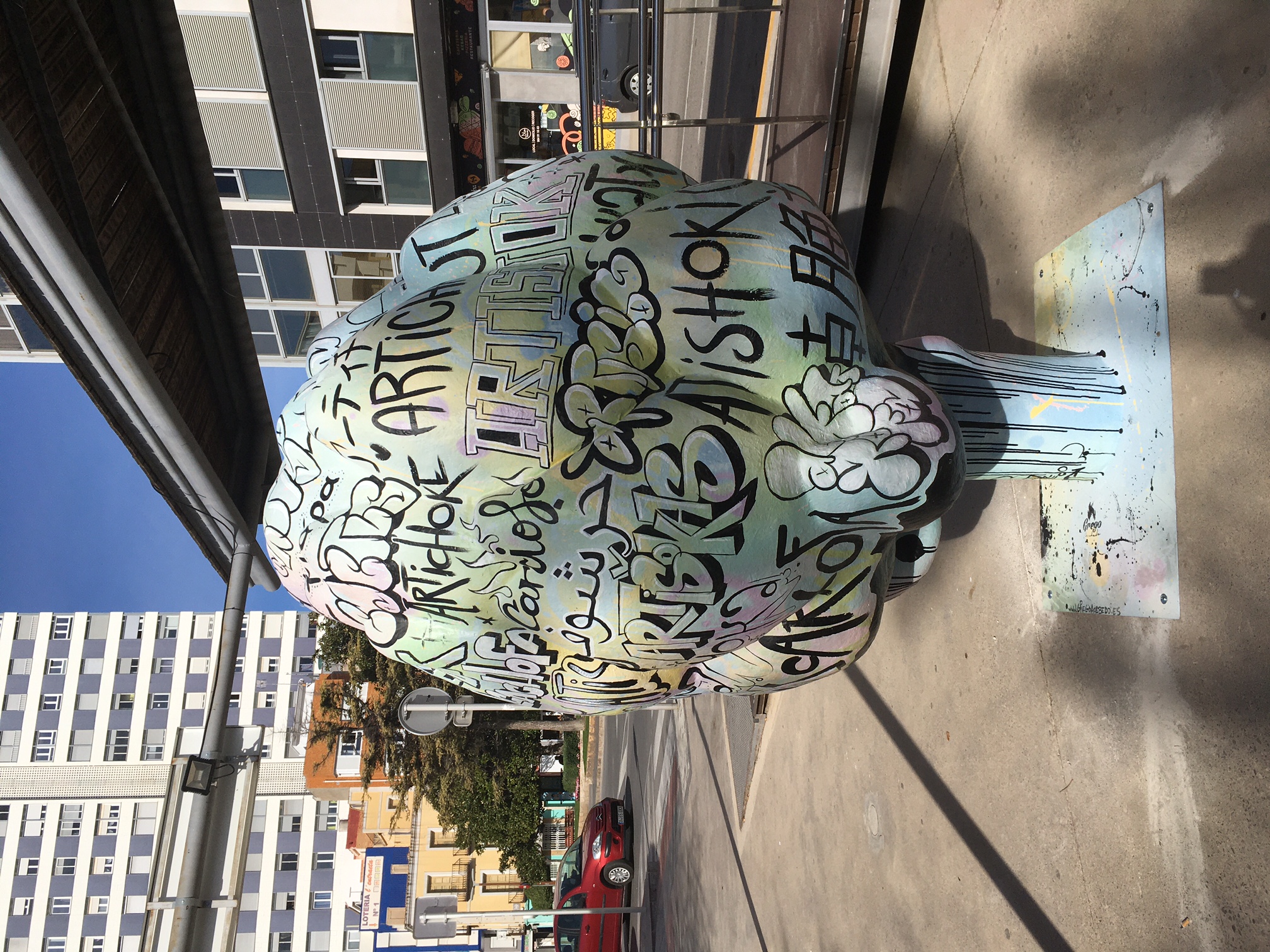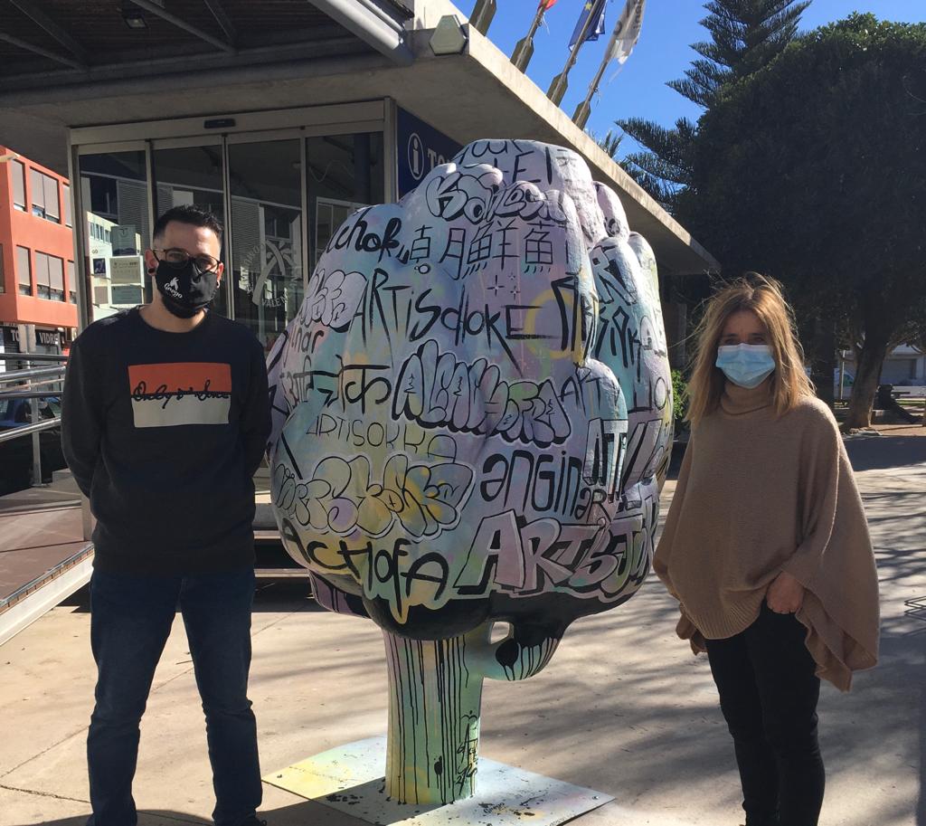 La primera de las nuevas esculturas, que ya se puede ver en la plaza de la Constitución, es la del artista Grego Acebedo, que ha optado por escribir la palabra «alcachofa» en 40 idiomas y diferentes tipografías, «en referencia a la multiculturalidad de Benicarló y al eco de la Alcachofa de Benicarló en los diversos países», ha detallado el artista.