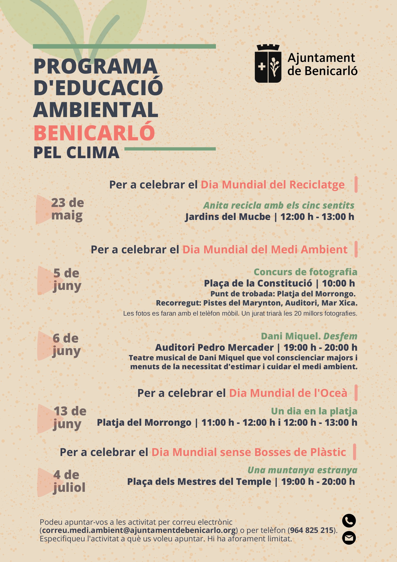 La programació començarà aquest diumenge de 12.00 a 13.00 hores amb un taller de reciclatge i un contacontes als jardins del Mucbe per a commemorar el Dia Mundial del Reciclatge. Les activitats continuaran el 5 de juny amb un concurs de fotografia i el dia 6 a les 19.00 hores s'ha programat a l'Auditori Pedro Mercader l'espectacle teatral musical de Dani Miquel «Desfem», tot per a commemorar el Dia Mundial del Medi Ambient. El 13 de juny d'11.00 a 12.00 hores i de 12.00 a 13.00 hores se celebrarà el Dia Mundial de l'Oceà amb diversos jocs a la platja del Morrongo.