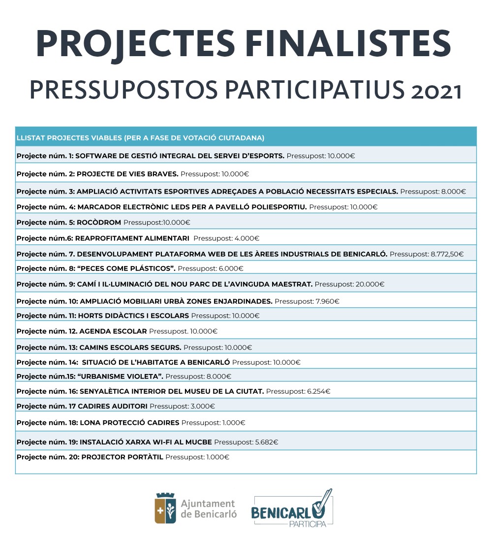 La regidora de Participació Ciutadana, Filo Agut, ha donat a conèixer els 20 projectes finalistes de la nova edició dels Pressupostos Participatius que es podran votar de l'1 al 15 de juny i que s'han recollit a través d'un ampli procés de treball que ha comptat amb la participació del teixit associatiu de Benicarló i dels cinc consells municipals (Consell Municipal d'Esports, Consell Municipal de Desenvolupament Local, Consell Agrari, Consell Municipal de Benestar Social i Consell Municipal de Cultura).