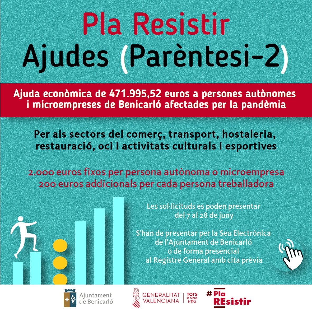 Les persones treballadores autònomes i les microempreses de Benicarló de menys de 10 persones treballadores, incloses en sectors com el comerç, el transport, l'hostaleria, la restauració o l'oci podran acollir-se a la segona convocatòria de les Ajudes Parèntesi que ha posat en marxa l'Ajuntament de Benicarló.