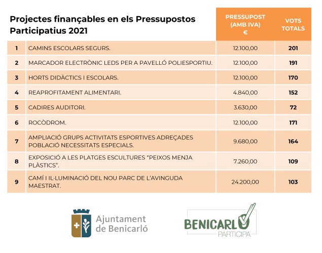 El Ayuntamiento de Benicarló ejecutará un total de 9 proyectos a través de los presupuestos participativos 2021. De las propuestas más votadas por la ciudadanía, a las cuales se destinarán un total de 100.000 euros, tres actuaciones corresponden al ámbito deportivo, y el resto se reparten entre los ámbitos social, comercial, cultural, turístico y urbanístico.