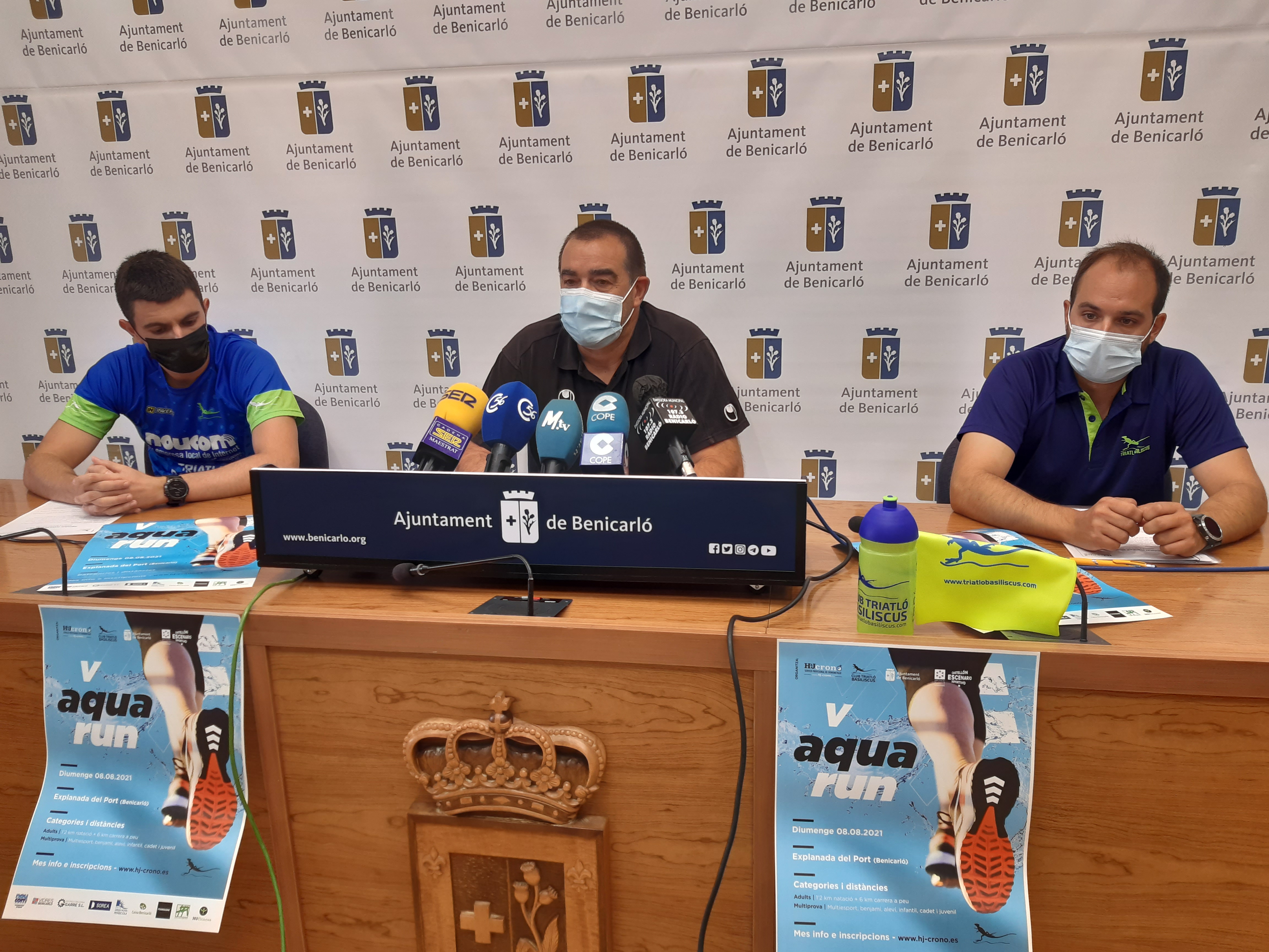 El regidor d'Esports de l'Ajuntament de Benicarló, Fernando Jovaní, acompanyat del president del Club Triatló Basiliscus, Vicent Prats, i el director tècnic de la cursa, Jesús Beltrán, ha presentat avui la cinquena edició de l'Aquarun, una cursa de caràcter eminentment popular que es reprén després de tres anys amb la voluntat de fomentar la pràctica de l'esport a l'estiu i de dinamitzar la zona portuària de Benicarló.