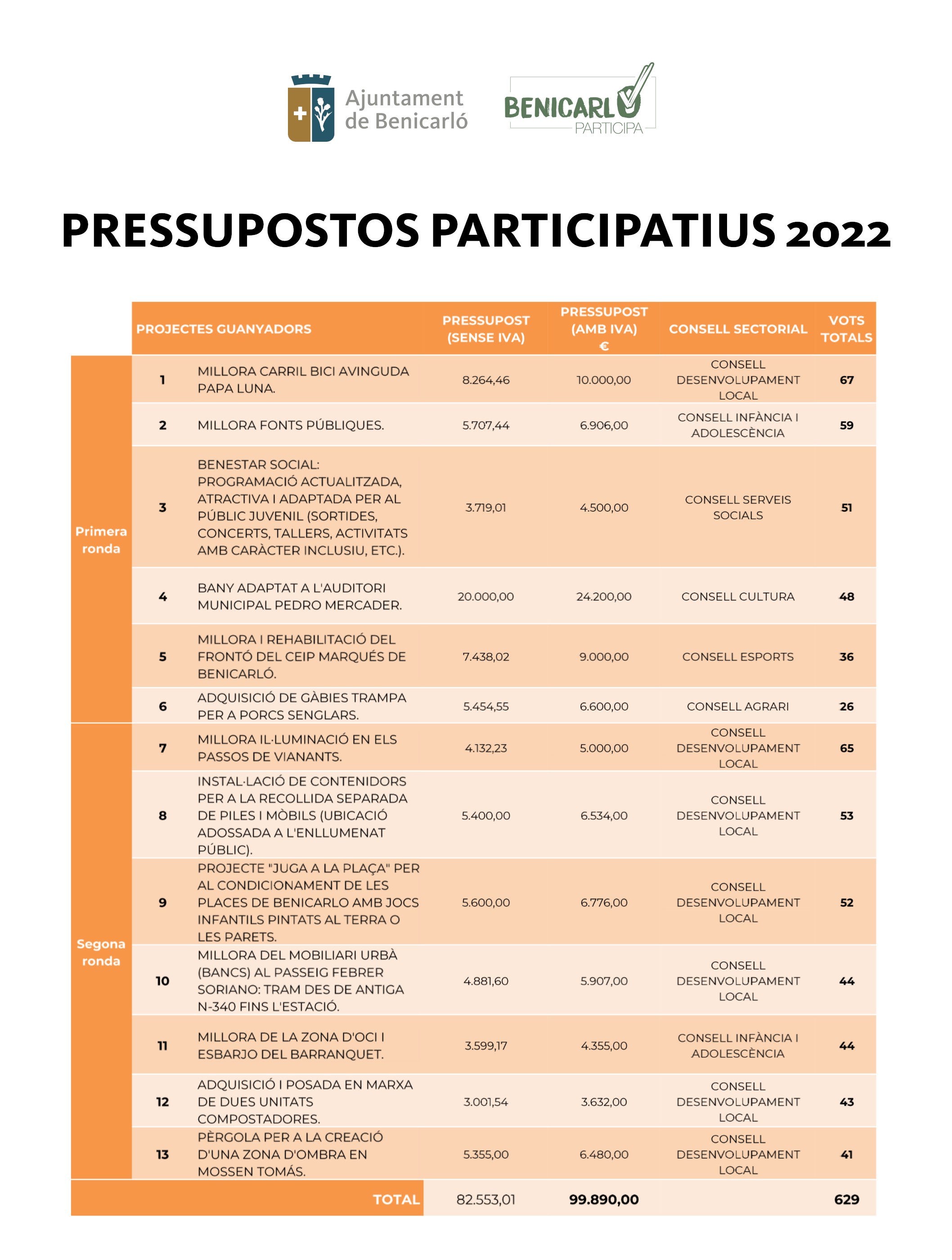 L'Ajuntament de Benicarló executarà un total de 13 projectes a través dels pressupostos participatius de 2022. Aquest ha estat el resultat del procés de votació que s'ha dut a terme durant el mes de juny i primers de juliol i que ha comptat amb la participació de 187 persones.