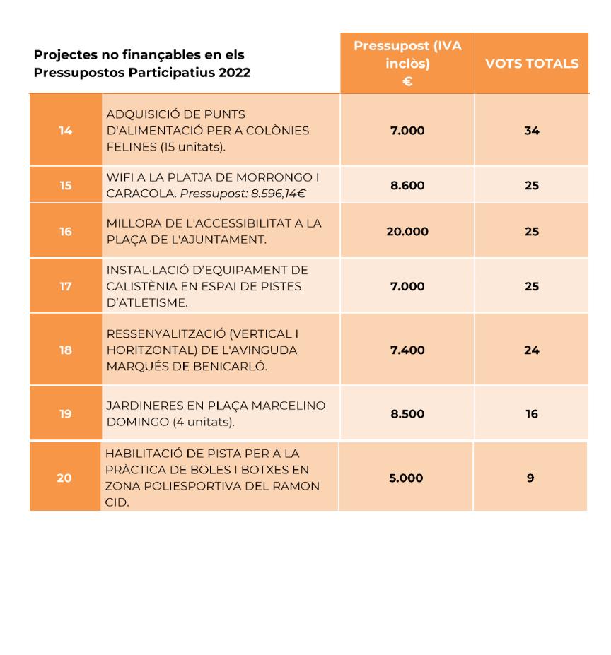 La resta de projectes més votats son l'adequació d'un bany adaptat a l'Auditori Pedro Mercader, la millora del mobiliari urbà al passeig de Febrer Soriano, la millora de la zona d'oci del Barranquet, l'adquisició de dos unitats compostadores, la instal·lació d'una pèrgola a la plaça de Mossén Tomás, la millora del frontó del CEIP Marqués de Benicarló i l'adquisició de gàbies trampa per a porcs senglars.