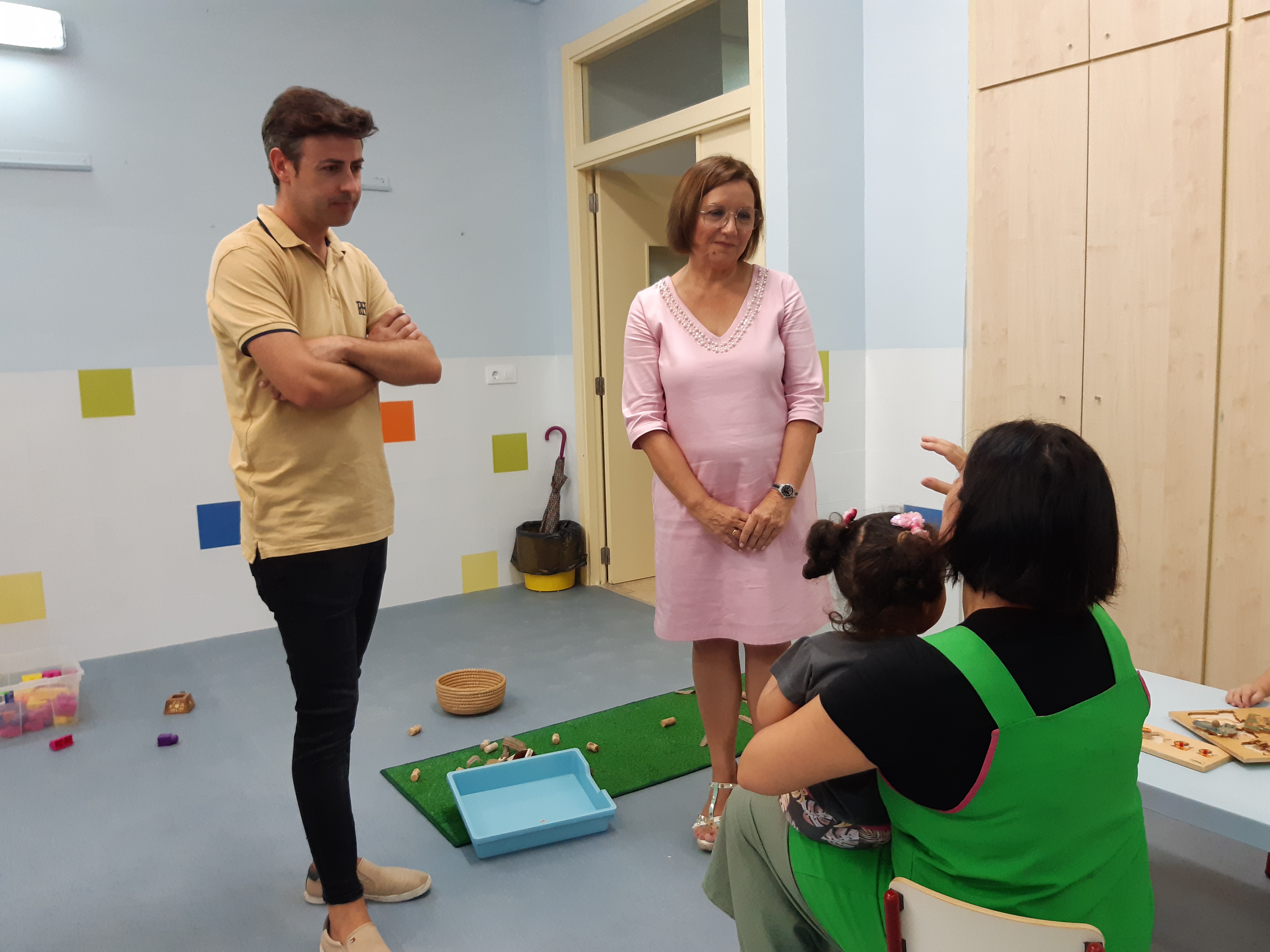 La alcaldesa de Benicarló y responsable del área de Educación, Xaro Miralles, y el regidor de la Brigada de Obras y Servicios, Ilde Añó, han presentado hoy las cifras del nuevo curso académico en el CEIP Mestre Francesc Catalan, donde este año ha empezado a funcionar una de las nuevas aulas de dos años.