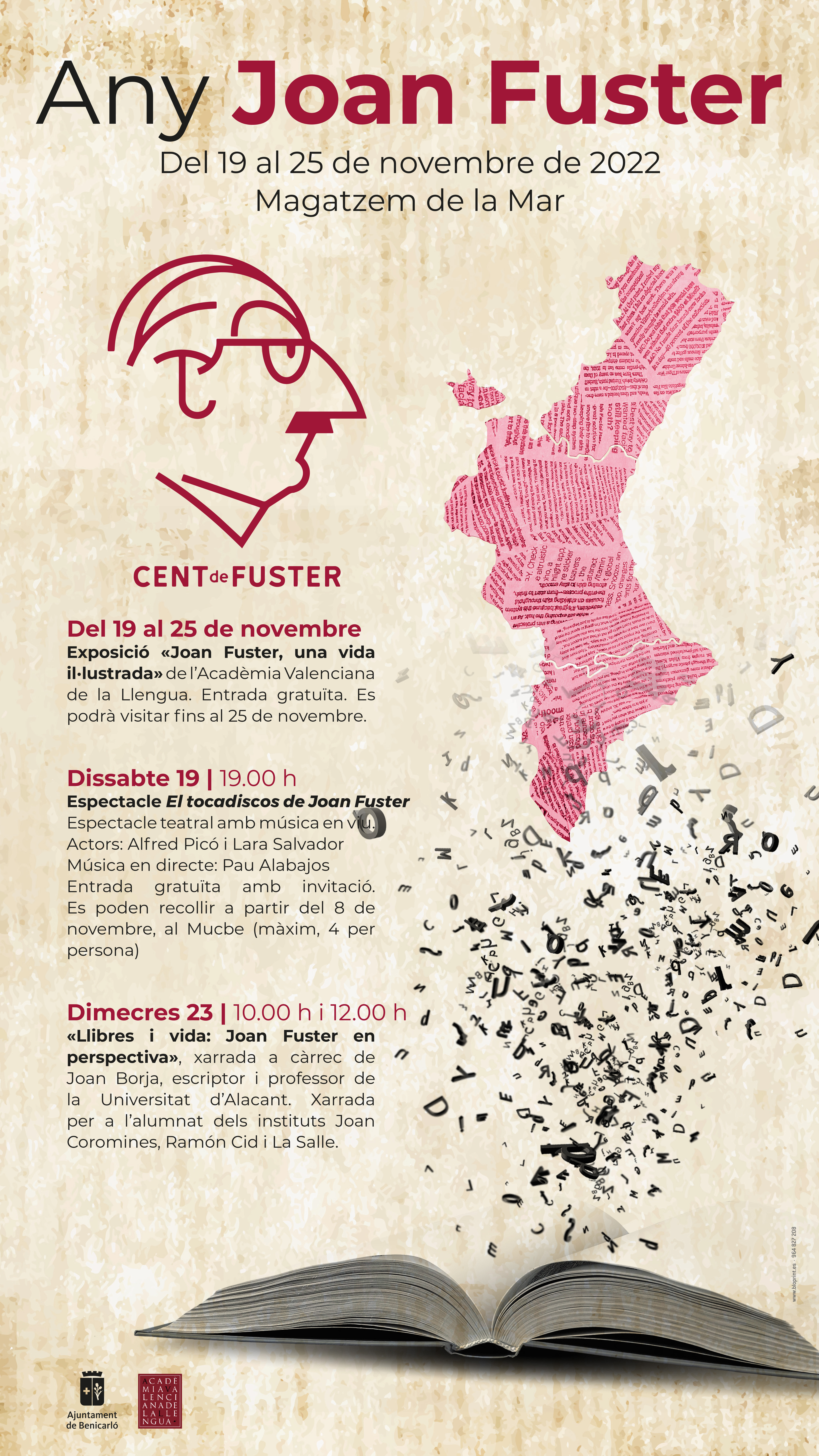 L'any 2022 marca el centenari del naixement de Joan Fuster, una figura cabdal per a les lletres i cultura valencianes. Del 19 al 25 de novembre, l'Ajuntament de Benicarló se suma als actes de reconeixement a aquesta figura de la cultura, per tal d'aprofundir i difondre al màxim el coneixement de la seua obra. Totes les activitats tindran lloc al Magatzem de la Mar.