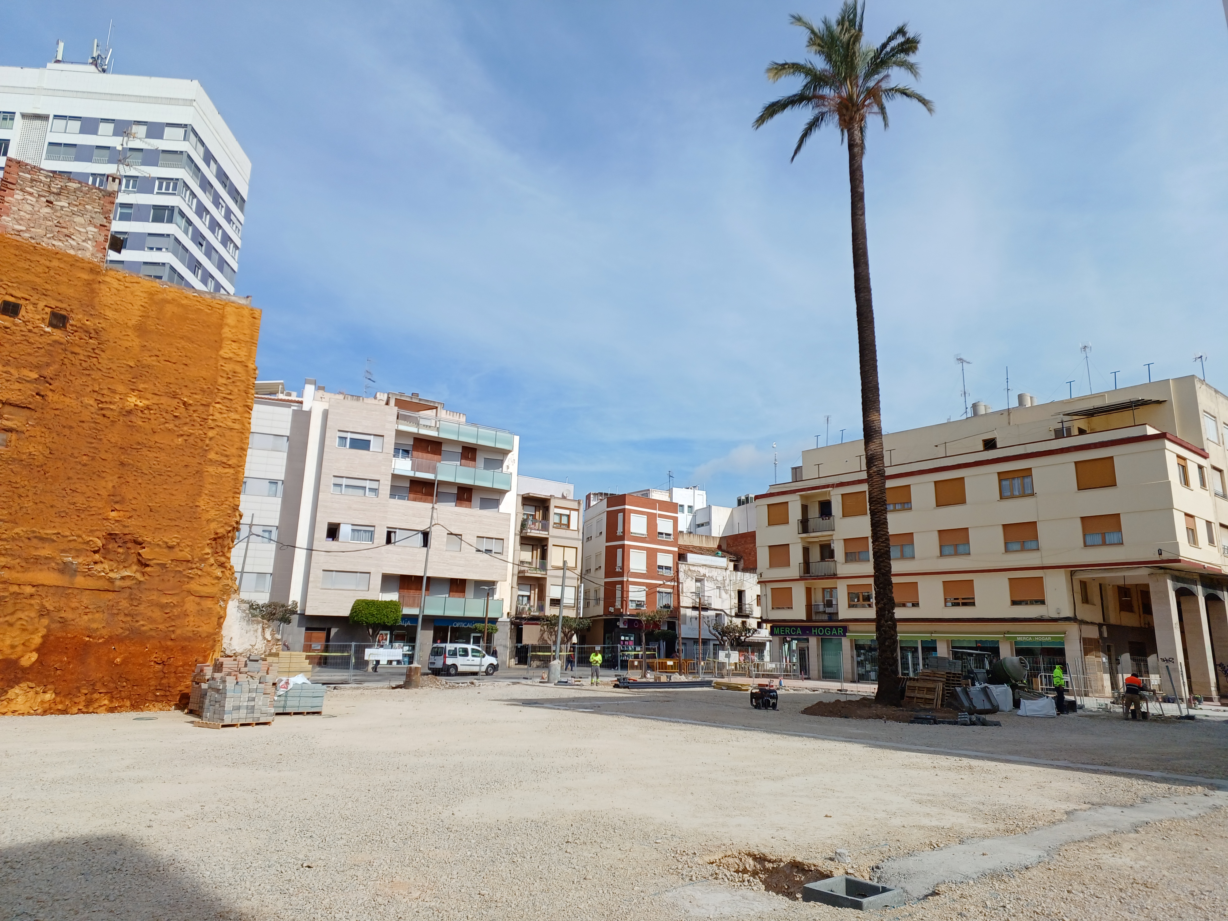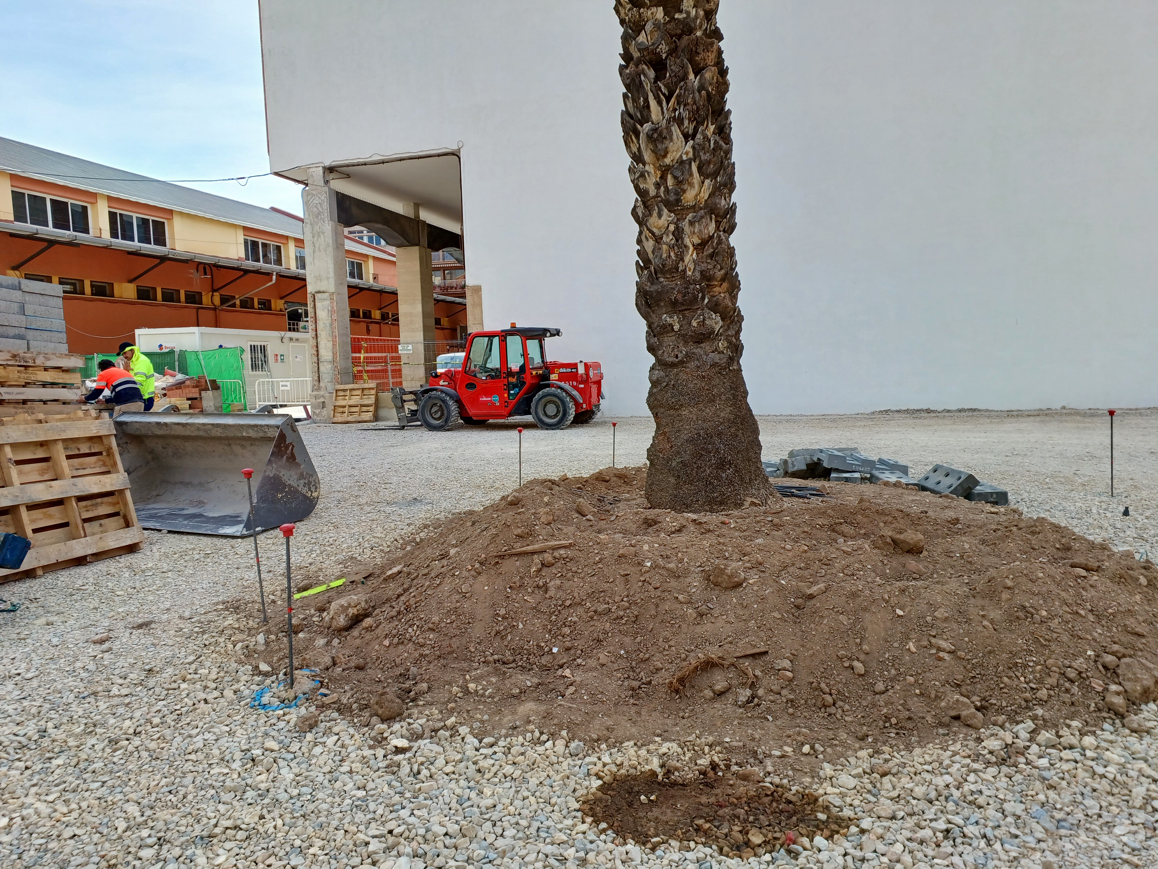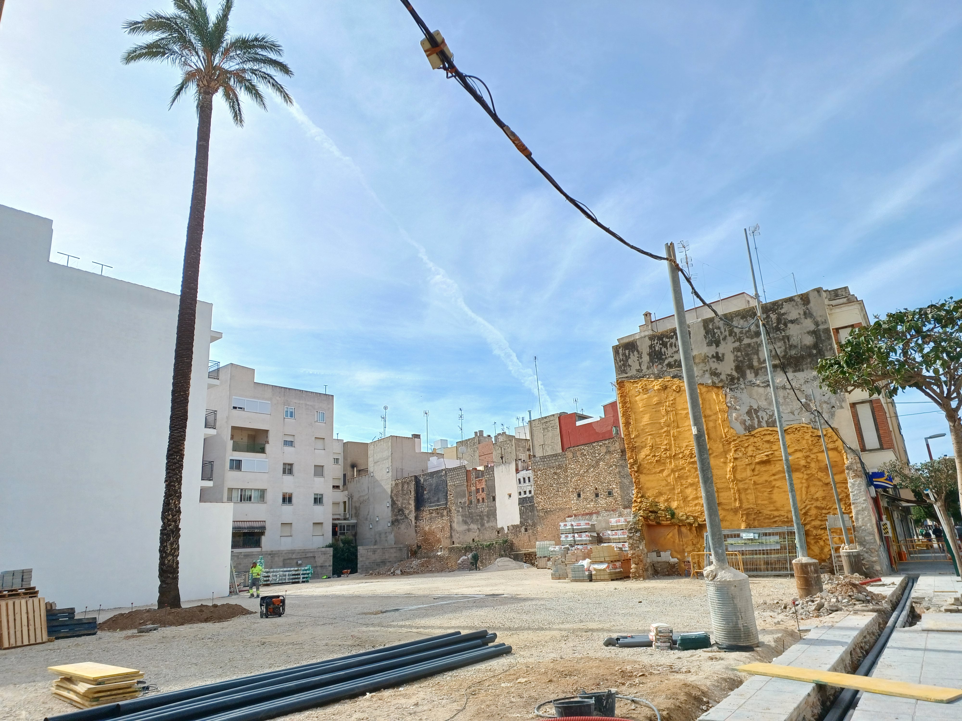 También se está trabajando en la cimentación de los báculos que dotarán de iluminación los más de 1.500 metros cuadrados del solar y en el alcorque que protegerá la palmera monumental que se encuentra en el centro de la parcela.