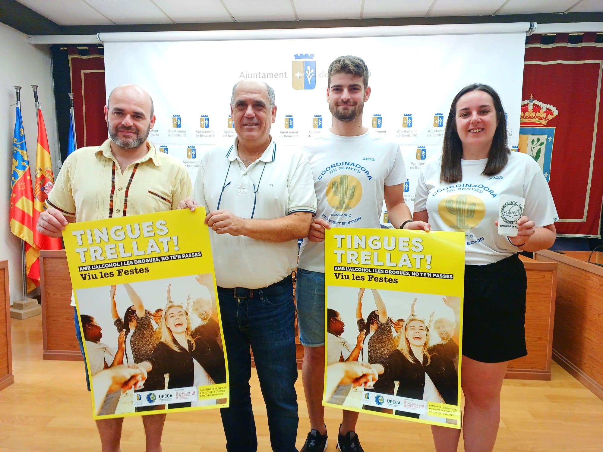 El alcalde de Benicarló, Juanma Cerdá, acompañado de la representate de la Coordinadora de Peñas, Mónica Gargallo, y del técnico de la Unidad de Prevención Comunitaria de Conductas Adictivas, Albert Rodríguez, ha presentado la campaña de sensibilización sobre el consumo abusivo de alcohol y otras drogas que la Concejalía de Servicios Sociales y Políticas Inclusivas ha puesto en marcha con motivo de las Fiestas Patronales.