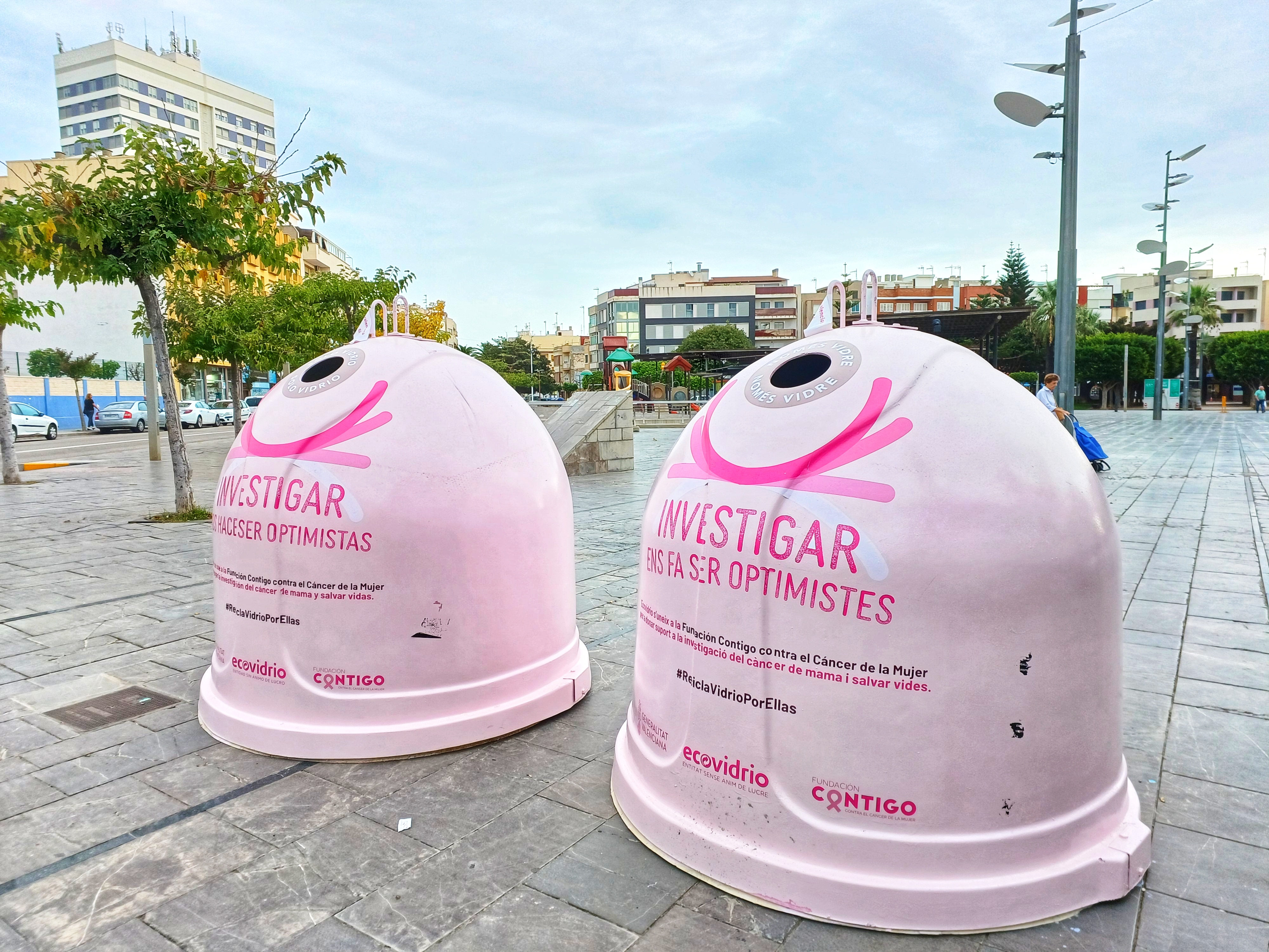 Dos contenidors de vidre de color rosa s'han ubicat a la plaça de la Constitució per a visibilitzar la lluita contra el càncer de mama. Ecovidrio i la Fundación Contigo són les promotores d'aquesta iniciativa.