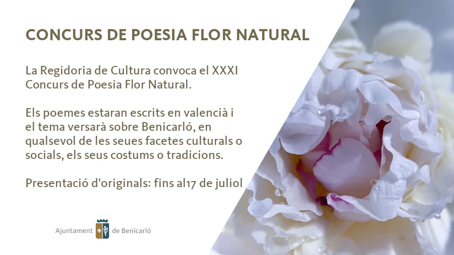 La Regidoria de Cultura ha convocat el Premi de Poesia Flor Natural, que té com a objectiu retre homenatge a la Reina de les Festes i la seua Cort d'Honor en el marc de les Festes Patronals de Benicarló.