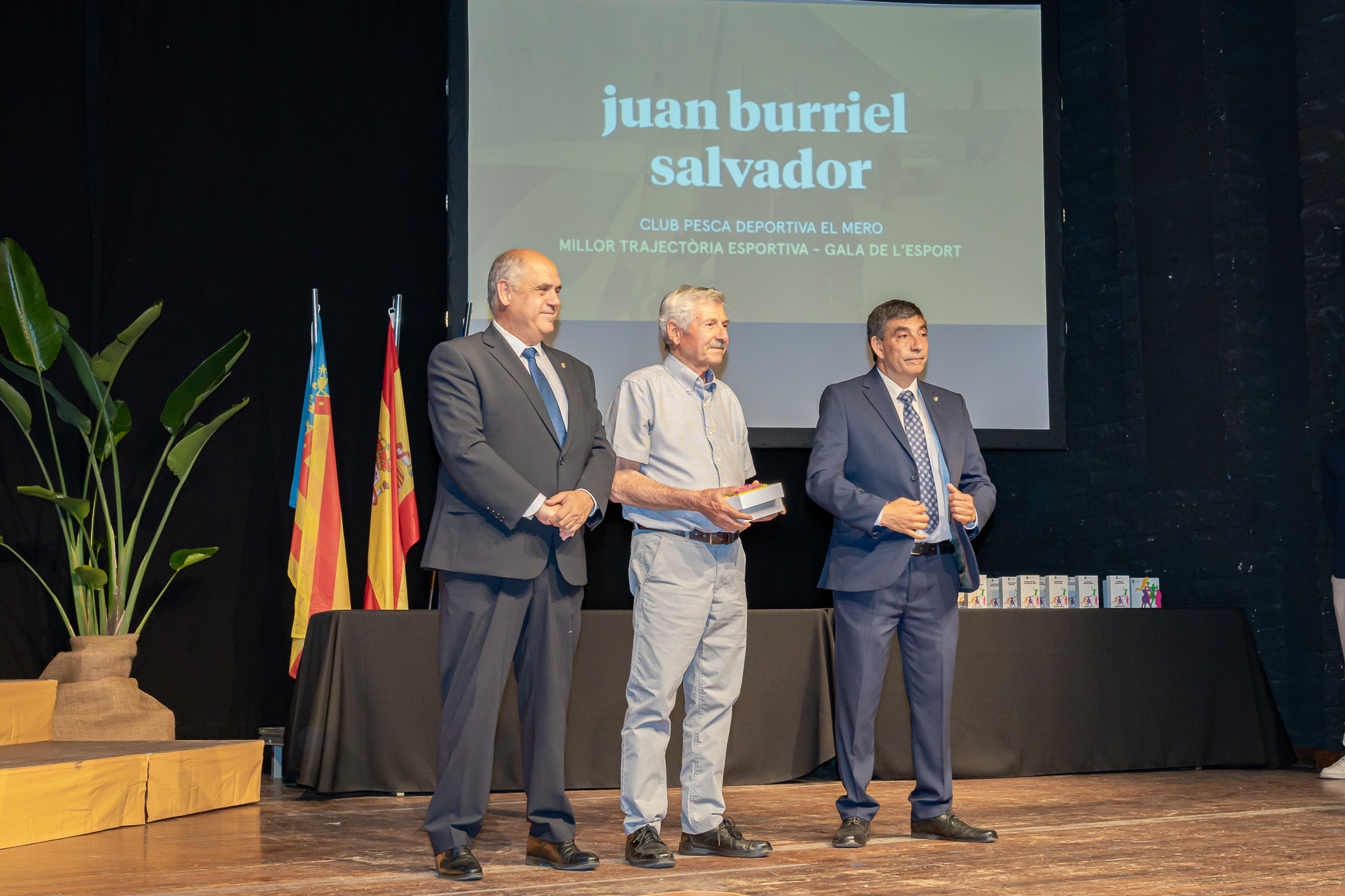 El premi a la millor trajectòria esportiva va ser per a Juan Burriel Salvador, conegut per portar més de 40 anys al Club de Pesca Deportiva El Mero. Burriel ha participat activament en totes les seues activitats i s'ha convertit en un referent en el món de la pesca a la ciutat de Benicarló. A més, ha exercit de delegat de concursos de l'entitat durant quasi una dècada, des de 1990 fins a 1998.