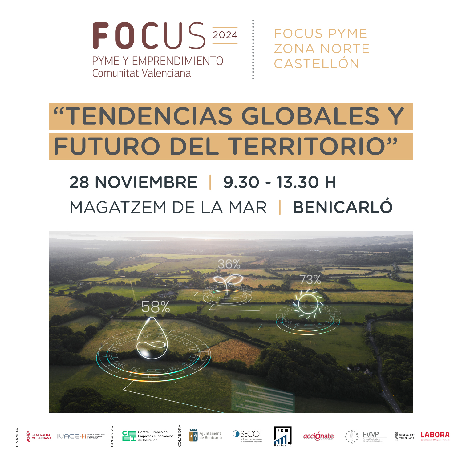 El pròxim dijous 28 de novembre, Benicarló serà la seu d'una nova edició del Focus Pime i Emprenedoria, una jornada organitzada pel Centre Europeu d'Empreses i Innovació de Castelló (CEEI Castelló) amb la col·laboració de l'IVACE, que analitzarà les tendències globals i els desafiaments del futur per a empreses i emprenedors.