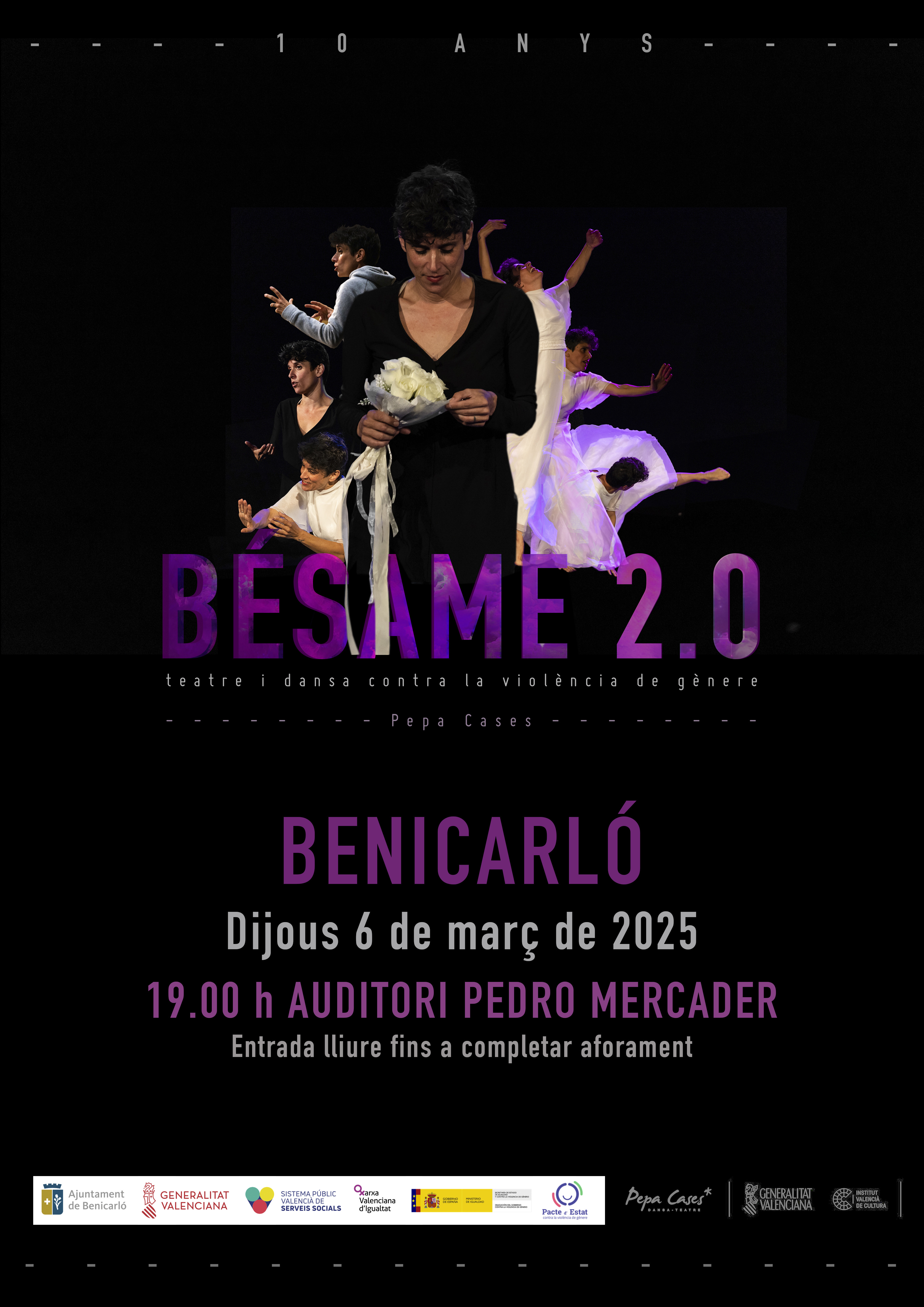 El jueves 6 de marzo, la programación continuará con el espectáculo 'Bésame 2.0', a cargo de Pepa Cases, una propuesta de teatro y danza contra la violencia de género que combinará comedia y tragedia para poner en evidencia esta lacra social. El acto tendrá lugar en el Auditorio Pedro Mercader a las 19.00 h, con entrada gratuita.