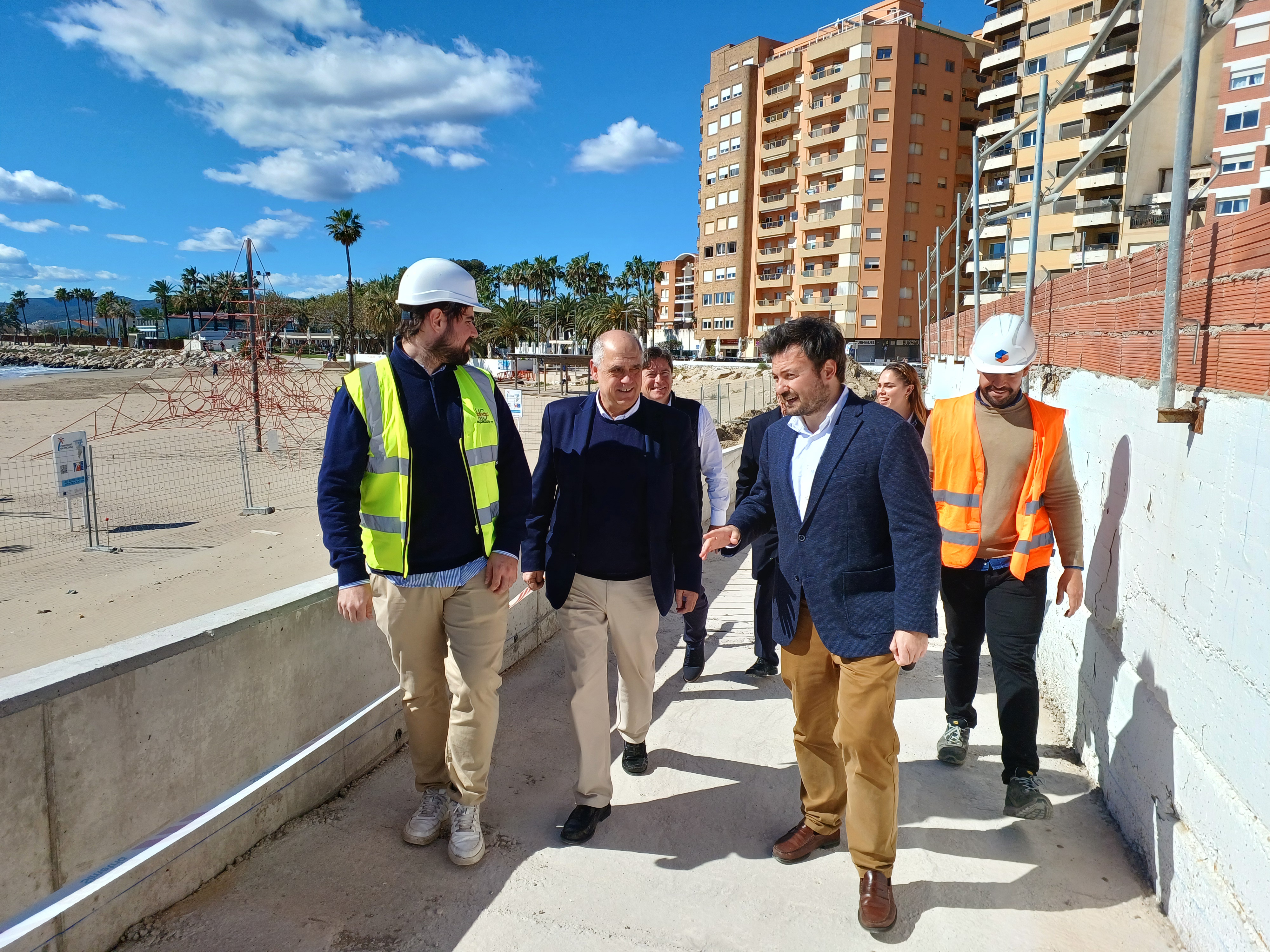El director general de Costes, Ports i Aeroports, Marc García, ha visitat avui Benicarló per comprovar l'evolució de les obres de construcció del nou passeig sobre la platja del Morrongo. Acompanyat per l'alcalde, Juanma Cerdá, García ha pogut constatar el bon ritme de les obres que, segons les previsions de la Conselleria, estaran finalitzades a finals de juny.