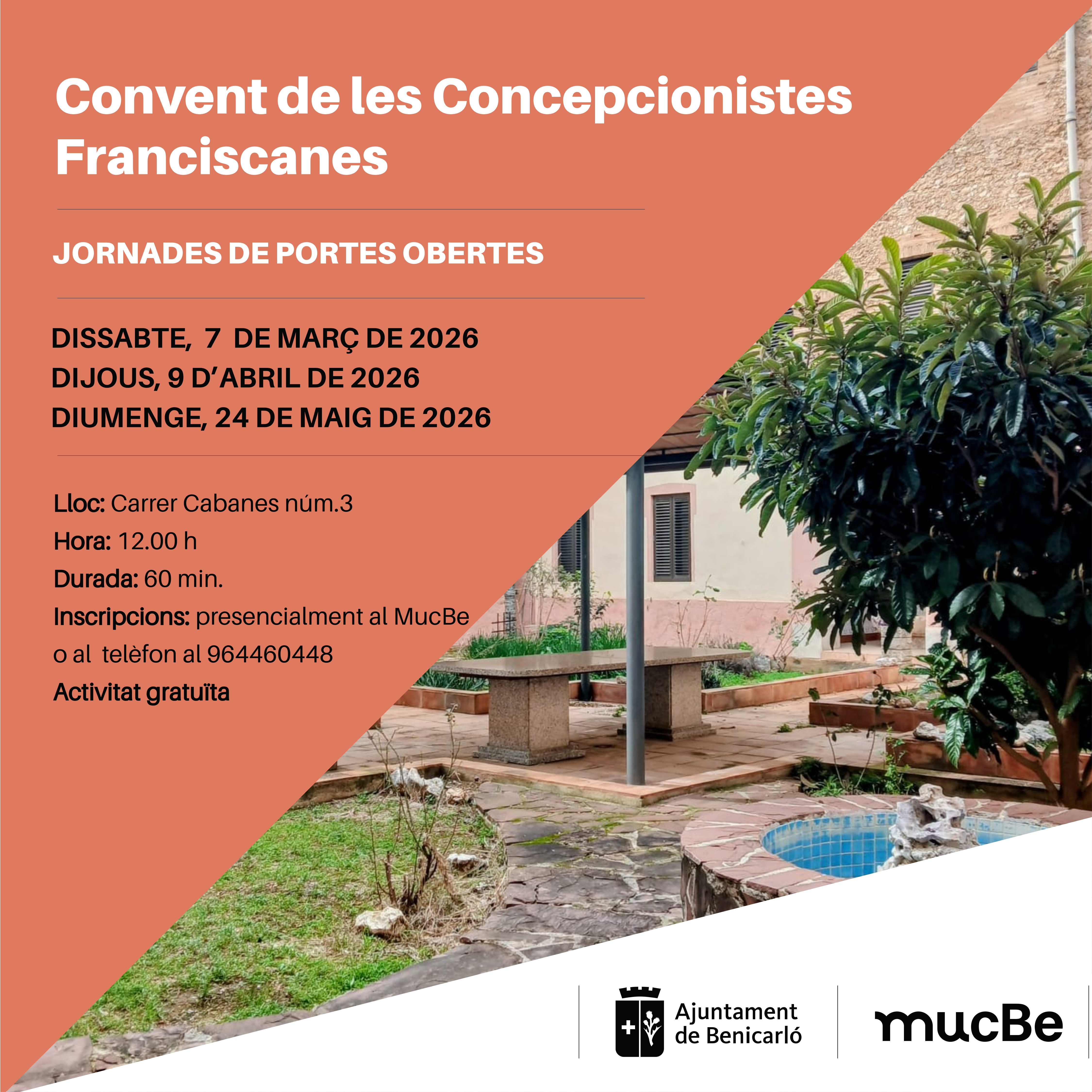 El Convento de las Concepcionistes Franciscanas acogerá tres jornadas de puertas abiertas los días 7 de marzo, 9 de abril y 24 de mayo de 2026, con visitas guiadas gratuitas para dar a conocer este espacio patrimonial de Benicarló.